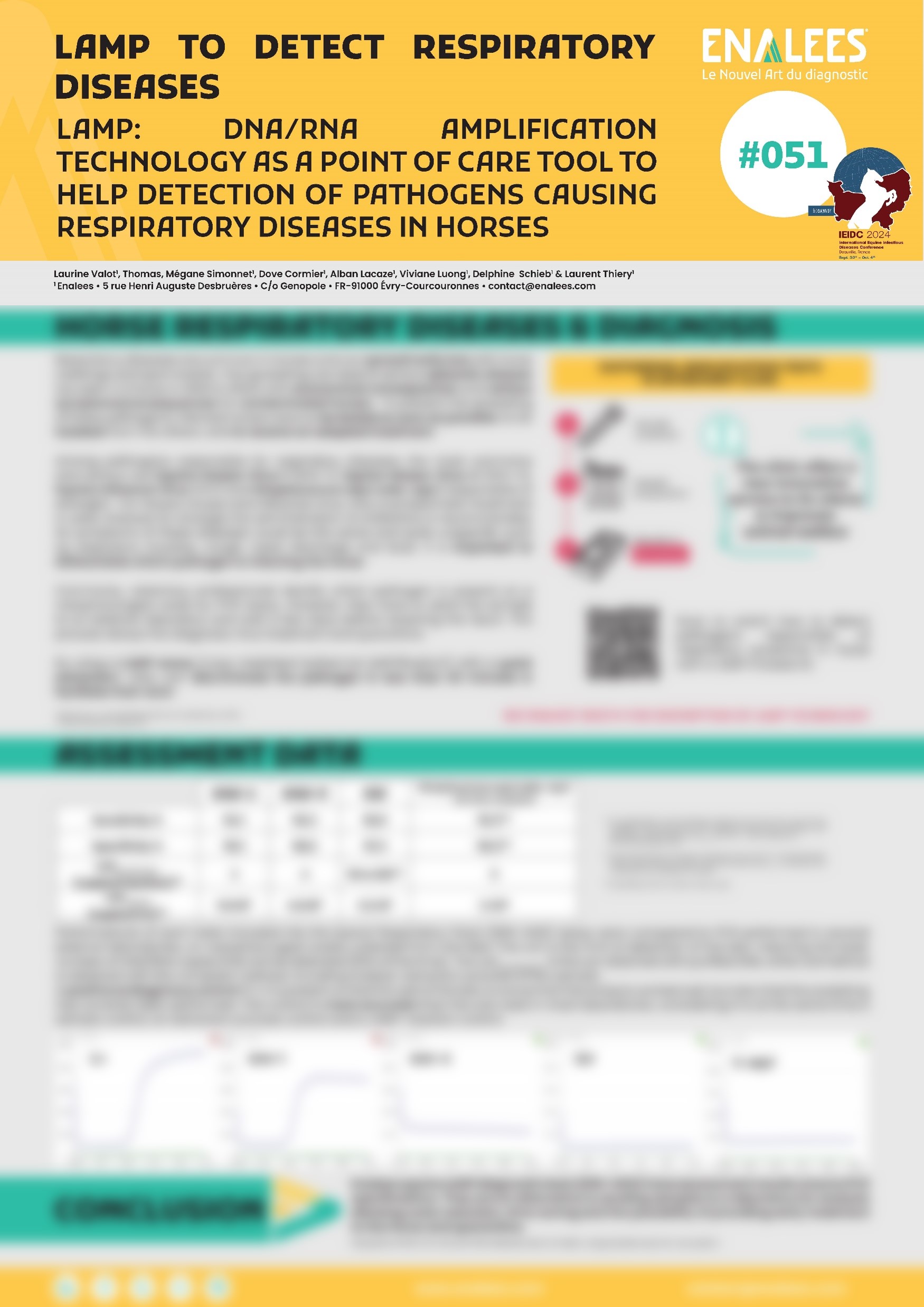 LAMP technology (Loop mediated isothermal AMPlification) is a NAAT technology (Nucleic Acid Amplification test) which can occur at constant temperature, unlike PCR which need thermal cycles. This allow the use of this technology as a POC (point of care) test and allow the obtention of the result in only 30 min without the necessity to use a thermal cycler. This technology can be really useful to detect highly contagious pathogens causing diseases in animals and the possibility to administrate medicine or isolate the animal immediately. In case of a pandemic, this technology can be useful to isolate quickly contaminated animals and avoid a propagation of the pathogen. Specific LAMP primers for EHV-1/EHV-4/Equine Influenza/Streptococcus equi equi were designed and LAMP reactions were performed on pathogen genome and on nasopharyngeal swab samples extracted by our own specific quick extraction. Performances of these tests were evaluated in our lab and compared to PCR performed in external labs. LAMP tests have a limit of detection for amplification between 1-40 copies/reaction dependant of the test. The limit of detection of the method (quick extraction and LAMP test) is similar or better of the limit of detection of the method (extraction on column and PCR test) obtained in a conventional analysis laboratory. LAMP test which was designed are really specific for the target (>95% specificity) and are really sensitive for the target (>90% sensibility). This technology is really fast (<30 min) and can be used as a point of care test. LAMP tests are a new generation of DNA/RNA amplification test, really specific, really sensitive which can be performed near a sick animal and can give a result in only 30 min. These parameters allow the consideration to use this technology to analyse quickly potential pathogens holder and treat or isolate the animal immediately.