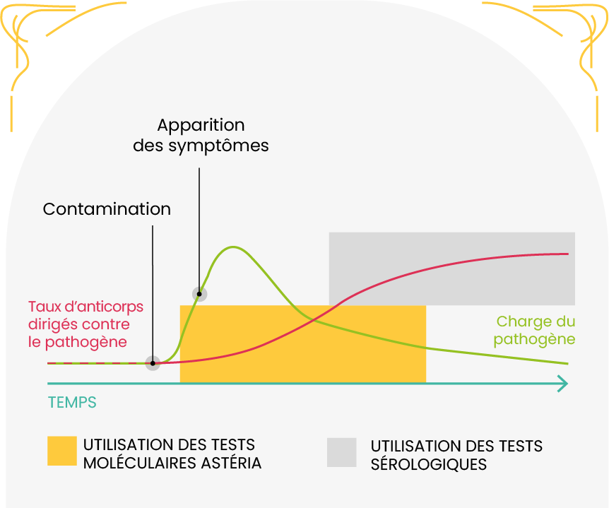 Nos tests Astéria® sont des tests de biologie moléculaire. Ils détectent directement l’ADN du pathogène et peuvent donc être utilisés dès le début de l’infection avant même que les symptômes ne soient décelables ou que la réponse immunitaire soit mise en place.