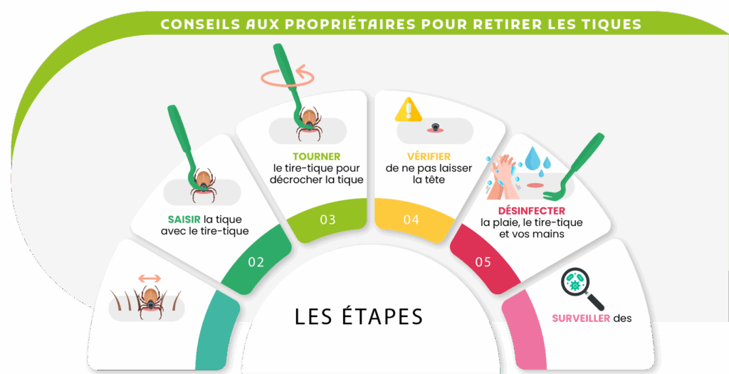 Encouragez les propriétaires à surveiller régulièrement leur chien pour détecter la présence de tiques. Dès qu’une tique est aperçue, elle doit être retirée à l’aide d’un tire-tique. Il est également important de surveiller la morsure et l’état général du chien pendant plusieurs jours, afin de détecter rapidement tout signe de maladie.